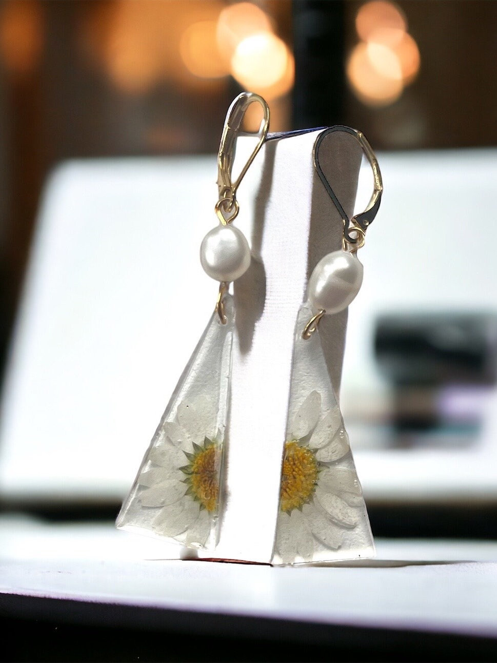 🌼Elevate your style with these exquisite handmade preserved real daisy earrings featuring a lustrous freshwater pearl, delicately secured with an 18ct gold plated clutch.