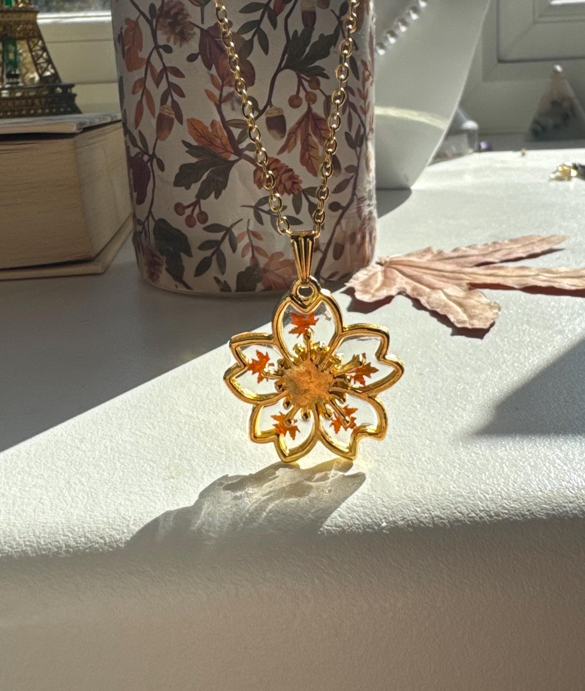 ✨ Details: • Handmade with love • Autumn flower pendant with golden autumn shine • Lightweight, comfortable, and easy to style • Pairs beautifully with boho, rustic, or elegant outfits • Available in adjustable chain lengths for a perfect fit