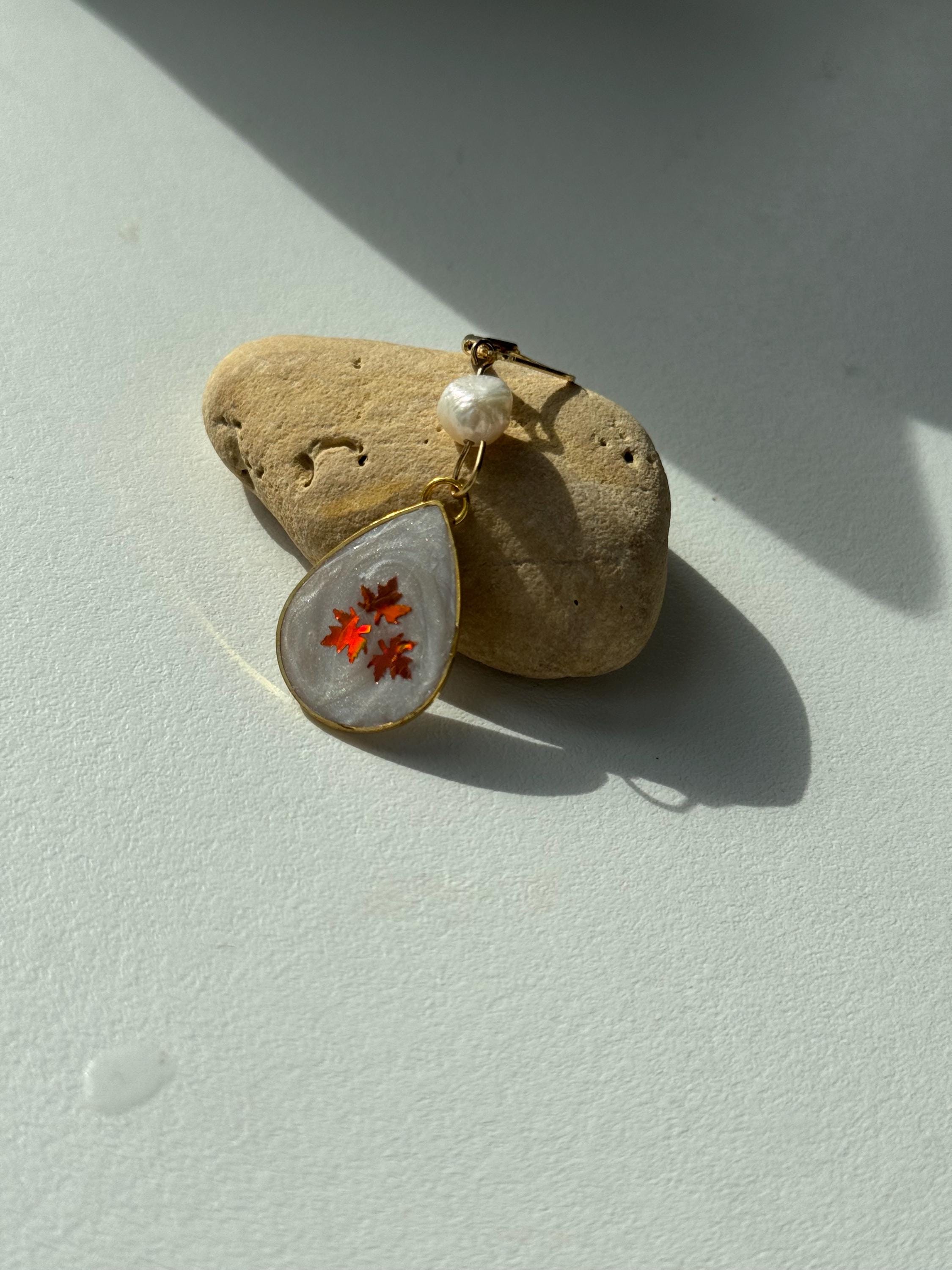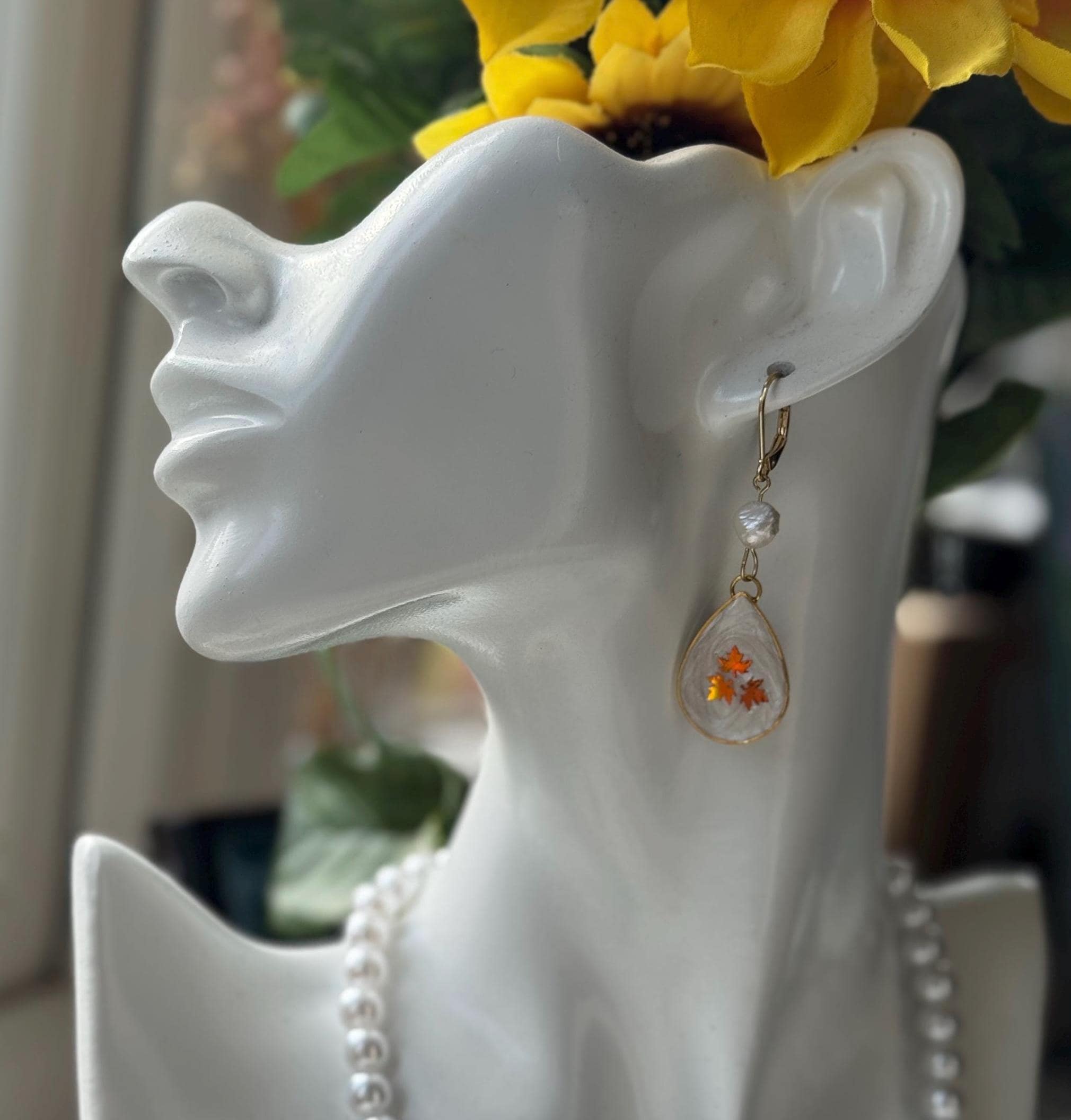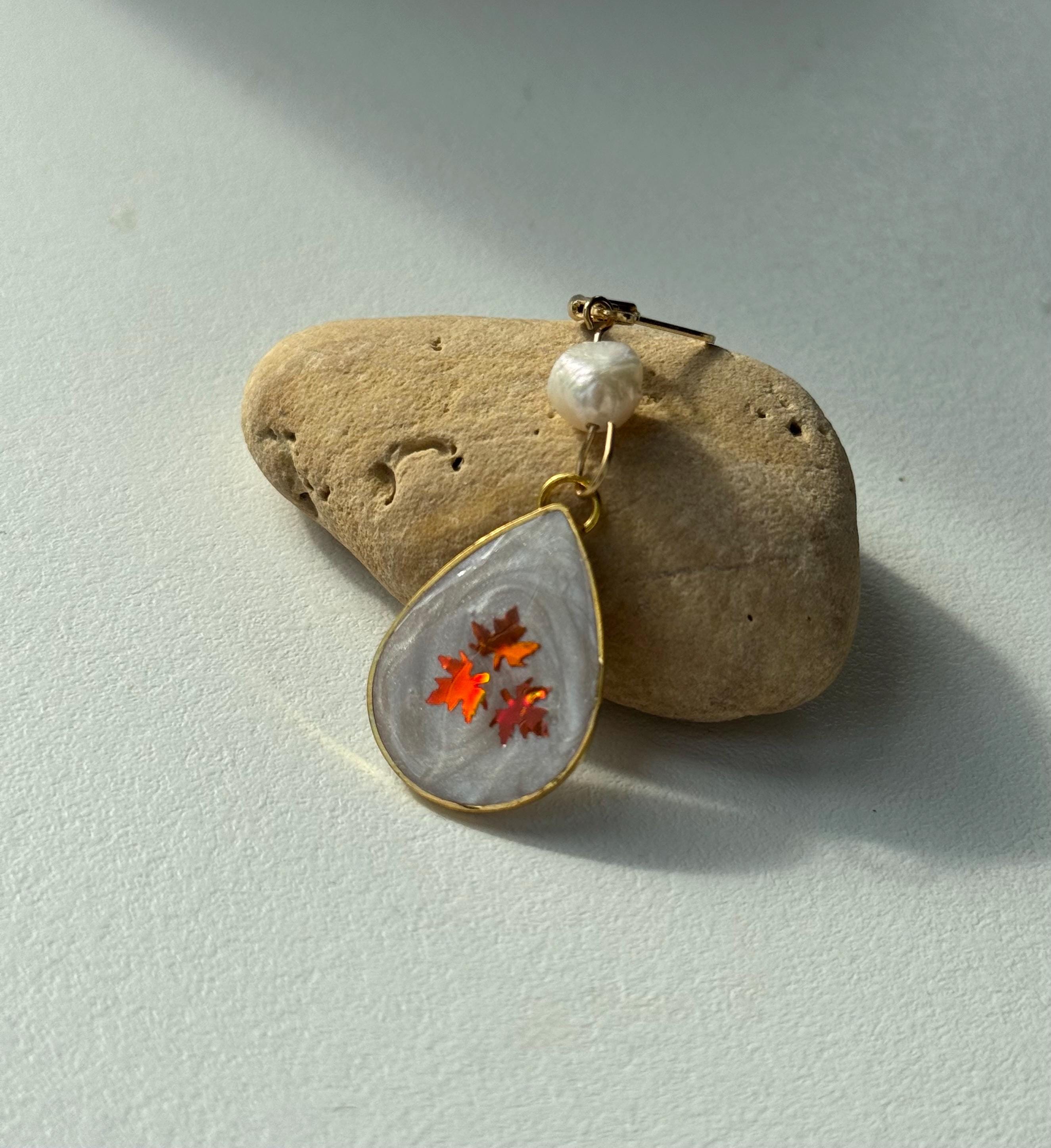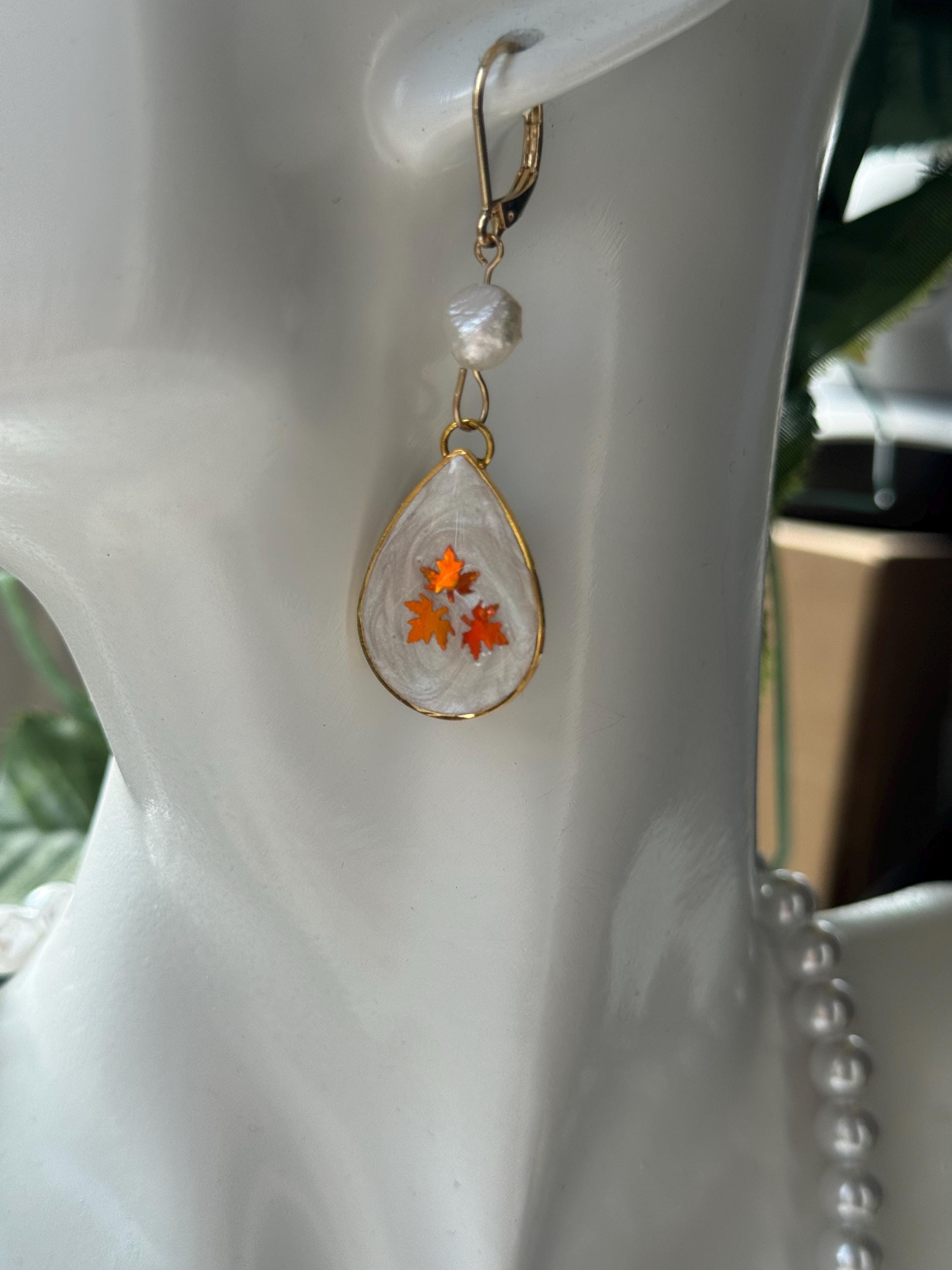 đ Details: ⢠Three detailed autumn leaves style set inside a teardrop frame ⢠Genuine freshwater pearl accent ⢠Lightweight + hypoallergenic hooks ⢠Handmade with love, each piece is unique